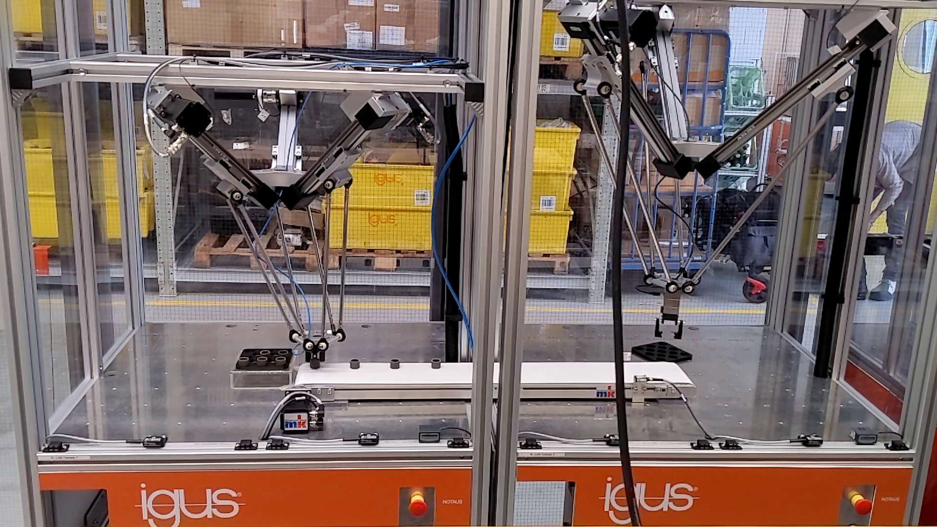 In this application, 2 Delta robots were positioned at the end of a Kitz assembly line. The first Delta robot places the components on the conveyor belt, while the second robot then removes and sorts them. The setup illustrates how partial automation with 2 robots in combination with an assembly line can be easily implemented.
