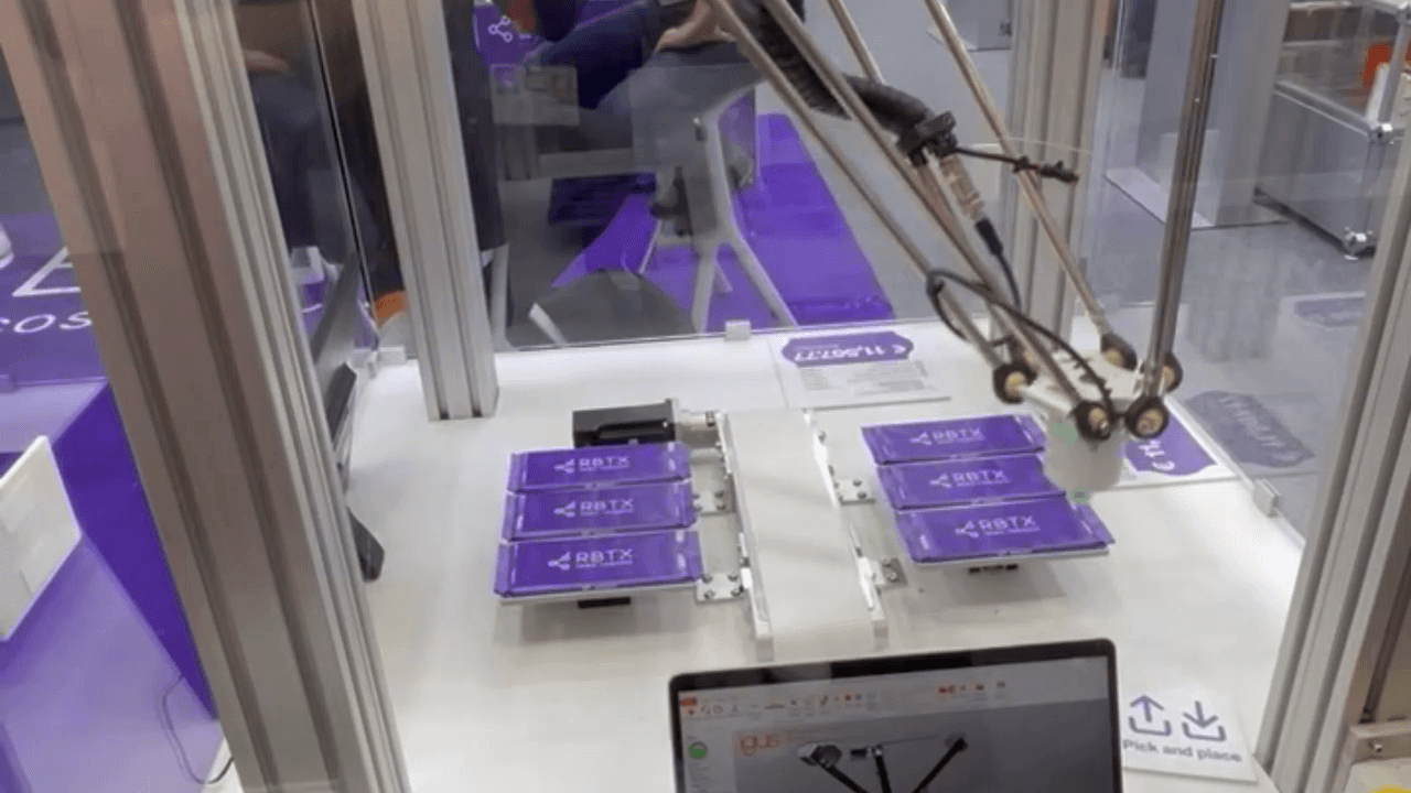 A robot cell in which there is a lot of movement quickly attracts many spectators at a trade show. Due to its fast motion sequences, the Delta robot is particularly well suited for demonstrating simple conveyor belt picking tasks, as was the case at our RBTX booth.